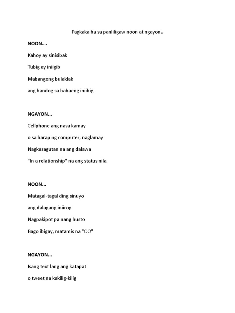 242021 Paghahambing Sa Kabataan Noon At Kabataan Ngayon. 1 question Pagkakatulad at pagkakaiba ng panliligaw ng mga binata sa dalaga noon at ngayonPAGKAKATULADPAGKAKAIBA. Noon ay pumupunta sa simbahan Upang humingi ng tawad sa nagawang kasalanan Ngunit bakit ngayoy marami nang kabataan Ang hindi marunong magdasal sa simbahan.
